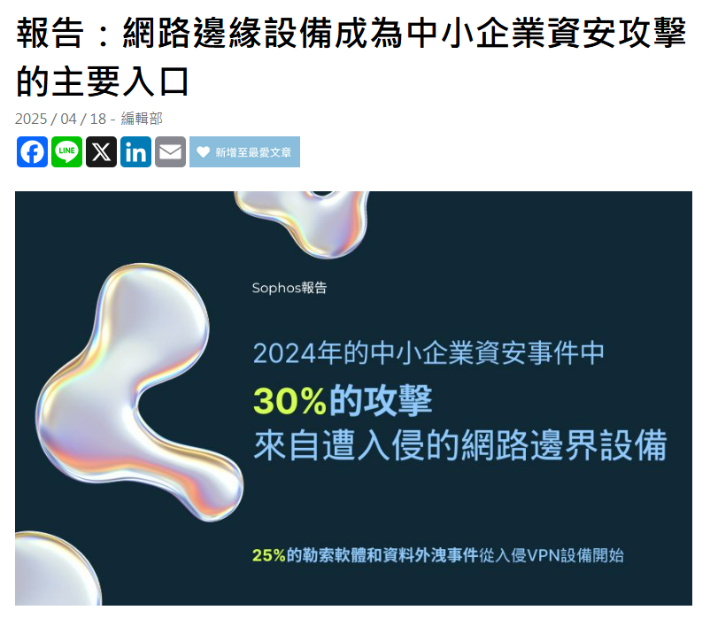 根據 Sophos 分析,2024 年中小企業(SMB)的資安事件中,30% 的攻擊來自遭入侵的網路邊界設備。這類設備包括 VPN 設備、防火牆及其他遠端存取設備。Sophos 威脅偵測與回應(MDR)的追蹤數據顯示,這些設備已成為網路入侵的主要來源,其中 VPN 漏洞利用佔所有攻擊事件的 19%。