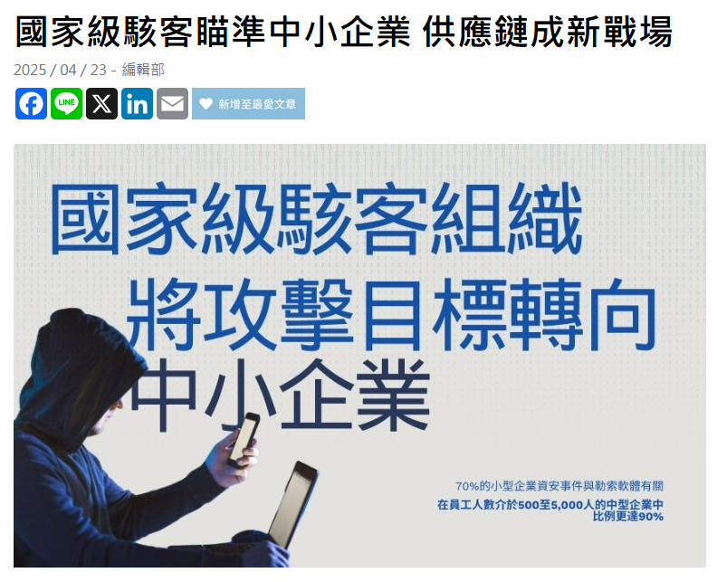 國家級駭客組織(Nation-state actors)近期將攻擊目標轉向中小企業,尤其鎖定為大型企業提供商品和服務的供應商。