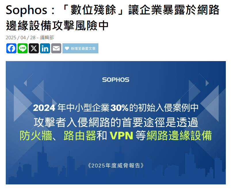 Sophos 發布了《2025 年度威脅報告》,揭示 2024 年中小型企業所面臨的重大安全威脅。根據報告,攻擊者入侵網路的首要途徑是透過防火牆、路由器和 VPN 等網路邊緣設備,這類設備約佔近 30% 的初始入侵案例。