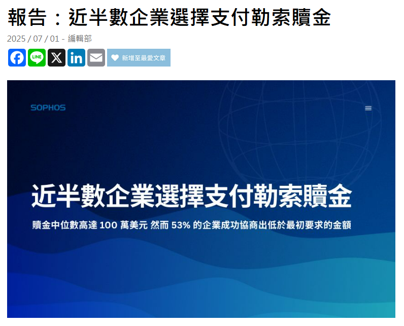 Sophos 發布第六屆年度《勒索軟體現況》報告。該報告為一項不特定廠商的調查,訪問來自 17 個國家的 IT 與資訊安全領袖,深入探討勒索軟體攻擊對企業的影響。調查結果顯示,近五成的企業選擇支付贖金以取回資料,這是六年來第二高的贖金支付比率。