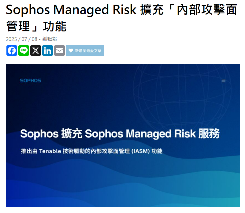 Sophos 宣布擴充 Sophos Managed Risk 服務,推出由 Tenable 技術驅動的內部攻擊面管理 (IASM) 功能。
