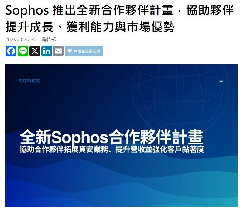 Sophos 宣布推出全新 Sophos 合作夥伴計畫,為合作夥伴創造多項全新商機,以加速業務成長、提供頂尖資安解決方案,並在競爭日益激烈的市場中取得差異化優勢。此計畫整合 Sophos 與 Secureworks 的全球合作夥伴,打造一個整合且高效的合作生態系,並在 Sophos 原有、深受全球逾 25,000 家合作夥伴信賴的獲獎合作夥伴計畫基礎上再進化。