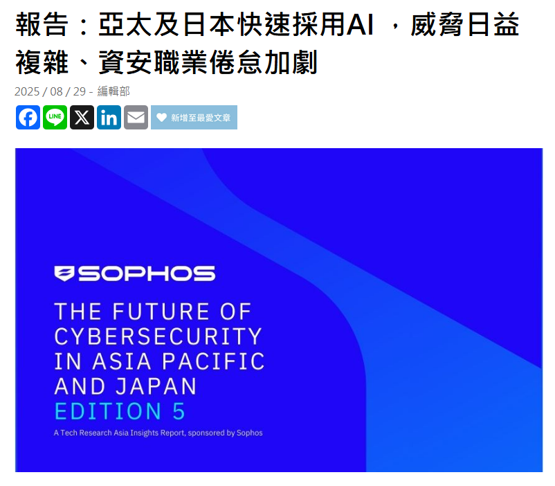 Sophos 發佈《亞太及日本地區網路安全未來展望》報告第五版,此報告由 Sophos 與 Tech Research Asia (現已成為 Omdia 一部分) 共同製作。調查結果顯示,該地區的資安倦怠情況依然嚴重,受訪組織中有 86% 表示面臨相關問題 (高於 2024 年的 85%),其主要原因包括威脅活動增加、資源不足以及日益複雜的法規要求。