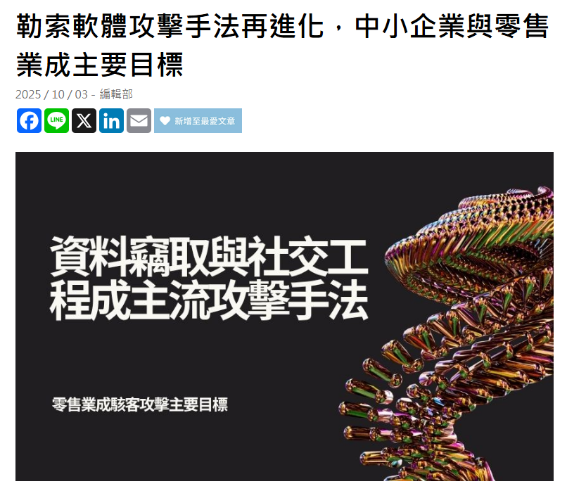 勒索軟體持續是企業面臨的最大資安威脅。根據安聯人壽(Allianz)發布的 2025 年網路安全韌性報告,駭客攻擊目標正在從防禦嚴密的大型企業轉向較易受侵害的中小型公司。資料顯示,中小企業遭遇的資安事件中有 88% 涉及勒索軟體,而大型企業僅佔 39%。2025 年上半年,勒索軟體仍是大型資安理賠的主因,佔所有超過 100 萬歐元理賠案件的 60%。