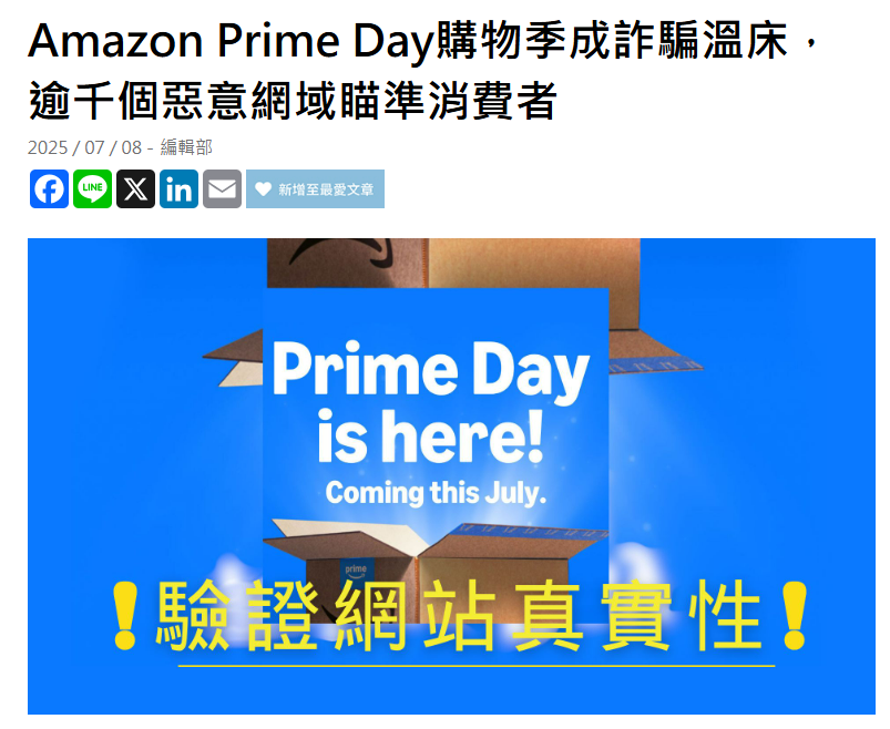 隨著Amazon Prime Day購物節即將到來,網路犯罪分子正蓄勢待發,準備對購物者發動大規模詐騙攻擊。資安公司Check Point最新研究發現,僅在6月份就記錄到超過1000個與「Amazon」和「Amazon Prime」相似的網域名稱,其中87%被標記為惡意或可疑網站。