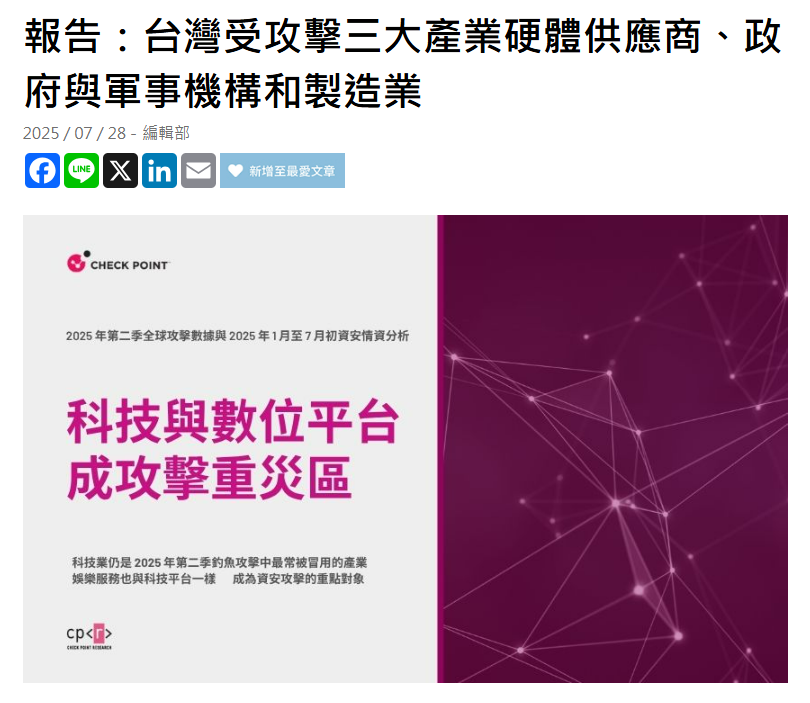 台灣情況格外嚴峻:平均每週遭受4,055次攻擊,位居亞太地區之首,攻擊頻率是全球平均值的兩倍以上。
