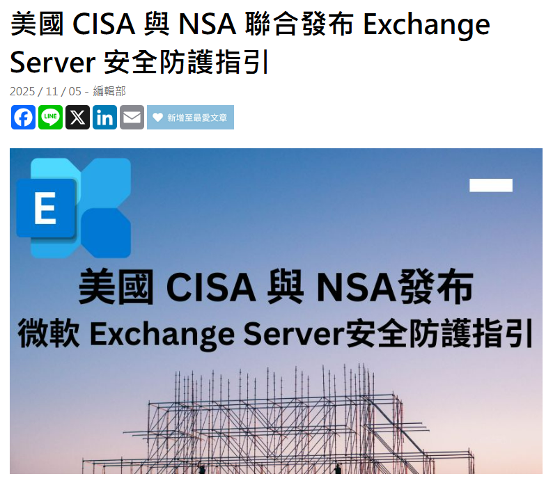 美國網路安全暨基礎設施安全局(CISA)、國家安全局(NSA),以及澳洲與加拿大的網路安全機構,聯合發布了一份針對部署微軟 Exchange Server 的安全強化指引。這份文件強調,組織可透過限制管理存取權限、實施多因素驗證、強制執行嚴格的傳輸安全配置,以及採用零信任安全模型原則,大幅提升防禦能力,抵禦潛在的網路攻擊。
