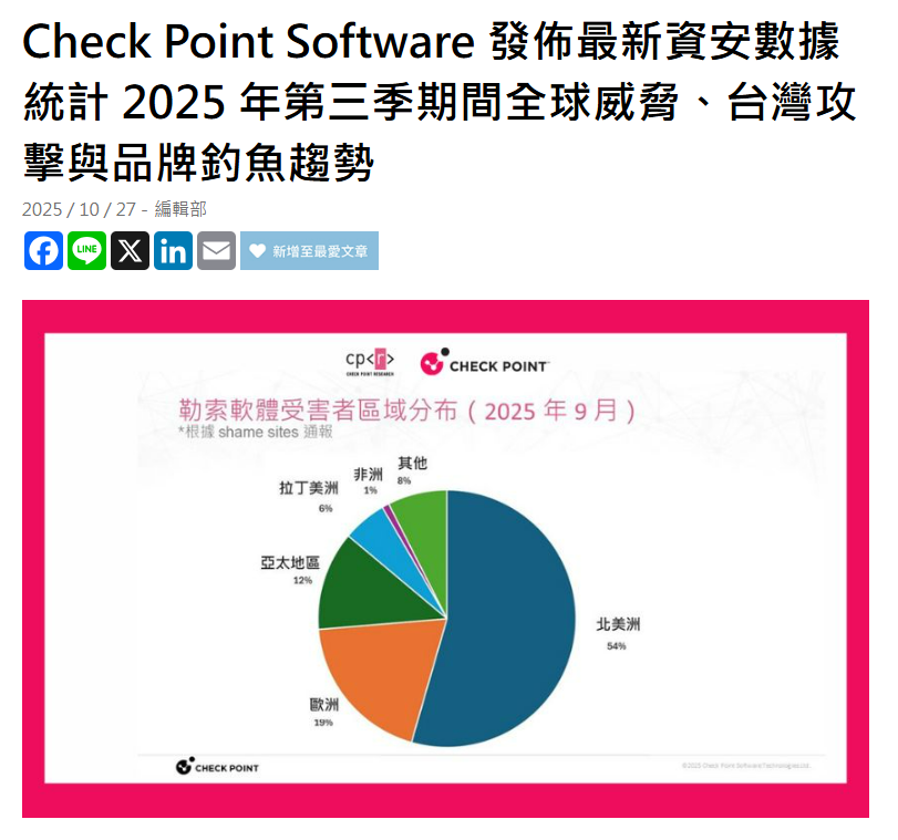 Check Point Software Technologies Ltd. 的威脅情報部門 Check Point Research 數據顯示,2025 年 9 月,全球組織每週平均遭受 1,900 次網路攻擊,較去年同期增長 1%。以各地區的每週平均攻擊次數而言,以非洲(2,902 次)與拉丁美洲(2,826 次)居全球前二,亞太則位居第三名(2,668次),其中台灣再度以高達 3,840 次位居亞太地區之首。