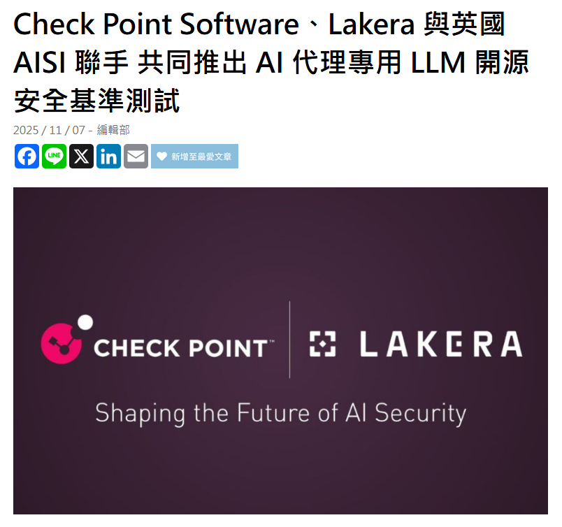 Check Point Software Technologies Ltd. 攜手近期收購專注於 Agentic AI 應用的 AI 原生安全平台 Lakera,以及英國人工智慧安全研究所(簡稱 AISI)共同宣布推出開源安全評估工具:骨幹破壞基準測試(backbone breaker benchmark),此工具是專為 AI 代理(AI agent)中的大型語言模型(LLM)安全性而設計。