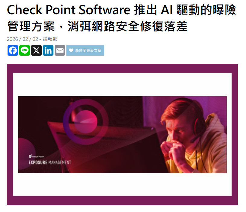 Check Point Software Technologies Ltd. 近日發布《曝險管理現況報告(State of Exposure Management)》,揭示組織面臨的威脅、漏洞與錯誤設定較以往更為嚴峻,於一年中識別出的全新威脅情資超過 7 億筆,且攻擊者從發現到利用情資的行動已縮短至數小時;相較之下,多數組織的回應速度仍偏慢,不僅平均修復時間(MTTR)長達 3.5 天,且一年僅約 50% 能完成修復。對此,Check Point 宣布推出 Check Point Exposure Management(曝險管理),透過全新方法將分散數據轉化為具優先順序、可執行且安全的修復措施,協助組織在 AI 時代有效反制網路攻擊。